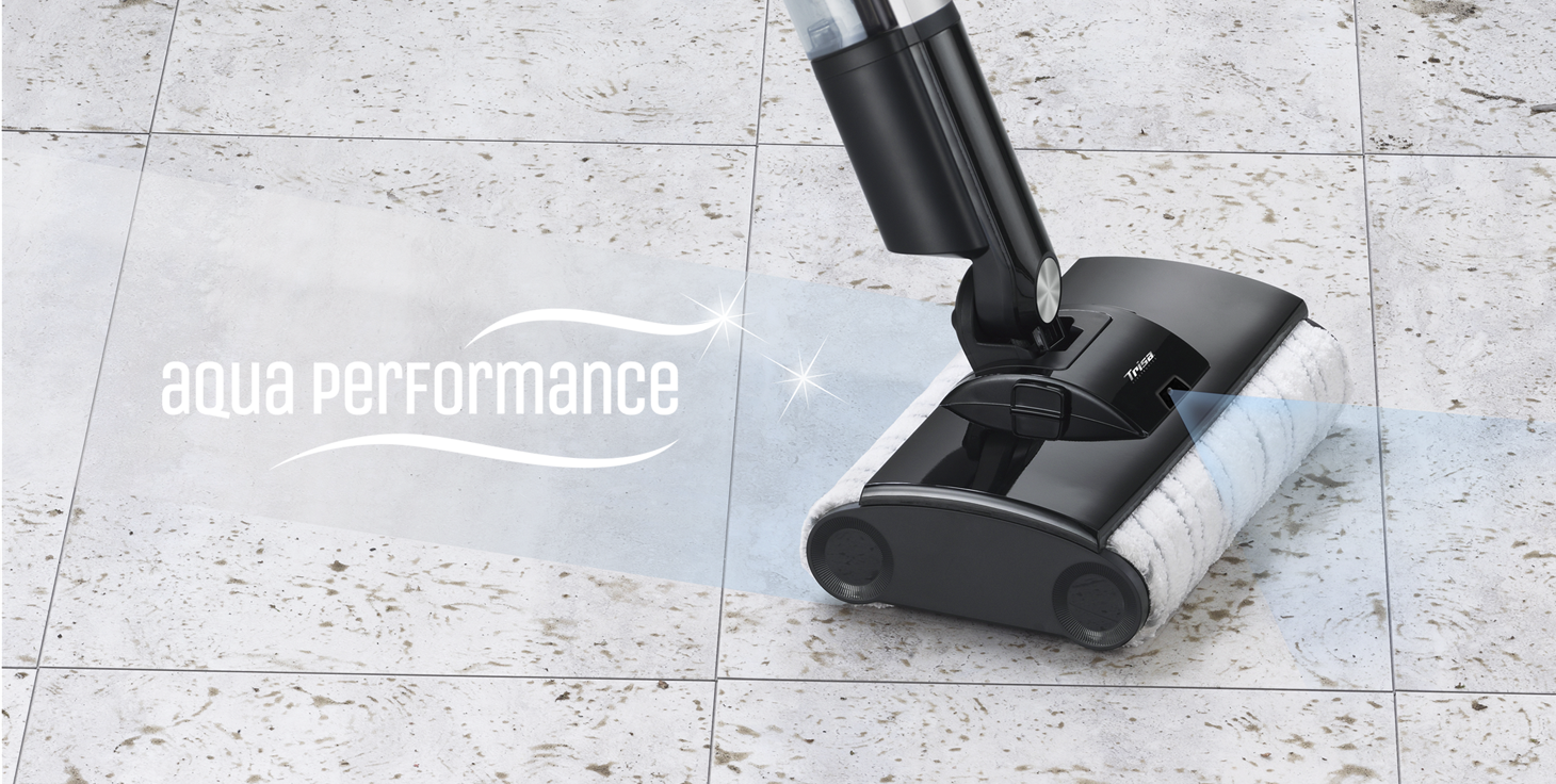 The innovative Trisa "Wet Clean Comfort T9746" battery-powered hard floor cleaner eliminates minor and major mishaps in a time-saving way. With the highly efficient double roller technology and outstanding 800 revolutions, up to 100 m2 of hard floor can be cleaned effortlessly in 30 minutes. While the front roller picks up dirt, the second dries the floor to give a shiny finish. The two rollers are made of a high-tech fibre that optimally picks up dirt and polishes the floor at the same time. You can clean tiles, laminate or sensitive wooden floors with this appliance without any worries. The two tanks hold 350 ml fresh water and 180 ml dirty water. Fresh water is added with each revolution, and the roller is immediately ready for use again. Another advantage: the multi-surface brush rollers can be washed in the washing machine. Maximum freedom of movement is guaranteed by the 16 V ion battery and the 60 W motor power. Thanks to the flat design, you can easily get under any article of furniture. The freestanding and self-cleaning functions are particularly advantageous.