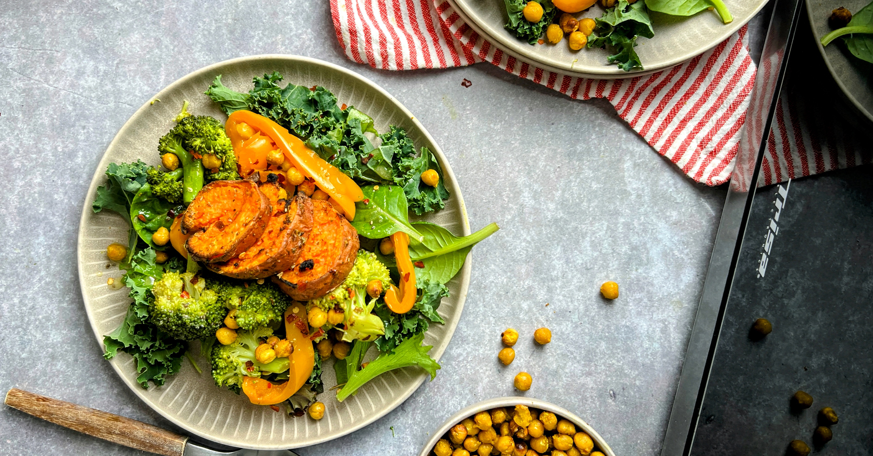 This sweet potato superfood salad combines both techniques and becomes wonderfully flavourful – with crunchy chickpeas, tender sweet potatoes, fresh vegetables and a light dressing.